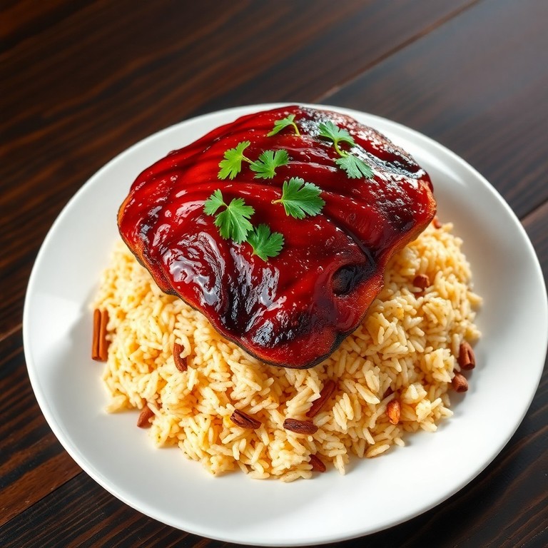 This dish features tender, smoky eisbein (pork knuckle) glazed in a luscious honey-soy sauce, served atop fragrant spiced rice. The smoky richness of the meat pairs beautifully with the sweet and savory glaze, while the aromatic rice infused with warm spices complements the flavors perfectly. A fusion of German-style smoked pork and Asian-inspired glaze and rice creates a uniquely satisfying meal.