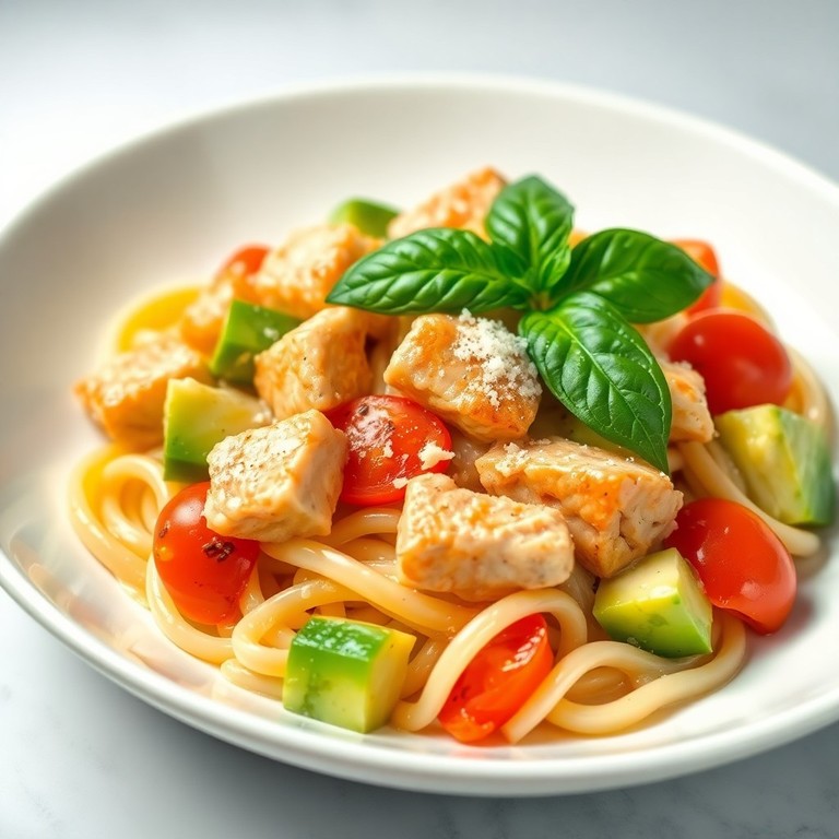 Una receta rápida y cremosa que combina pollo jugoso, aguacate suave y pasta al dente, perfecta para una comida completa y deliciosa. Ideal para quienes buscan un plato principal nutritivo y lleno de sabor, con la frescura del aguacate y la dulzura del tomate complementando la textura cremosa de la salsa.