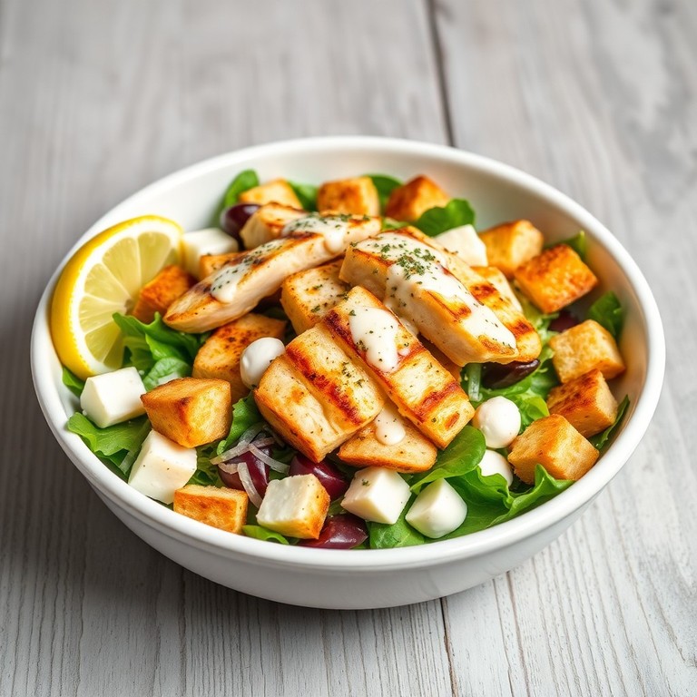 Uma salada fresca e leve que combina tiras suculentas de frango grelhado, queijo mussarela em cubos, pedaços crocantes de pão torrado e um molho cremoso à base de iogurte natural. Ideal para uma refeição rápida e nutritiva, perfeita para dias quentes ou para quem busca uma opção saudável e saborosa.
