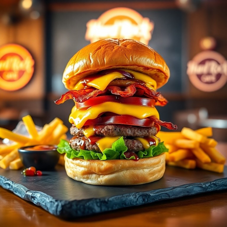 Ein saftiger Burger, inspiriert vom legendären Hard Rock Cafe: Würzig geschmolzener Cheddar, knuspriger Speck und ein fluffiges Brioche-Brötchen sorgen für echtes Rock-Feeling. Perfekt für einen schnellen, aber besonderen Genuss – ideal für Burger-Liebhaber, die den Geschmack von Freiheit und Musik lieben. Mit frischem Salat, Tomaten und einer rauchigen BBQ-Sauce wird dieser Burger zum Star jeder Küche.