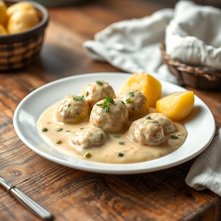 Klassische deutsche Fleischklopse aus gemischtem Hackfleisch, serviert in einer samtigen, weißen Kapernsauce. Dieses traditionelle Gericht aus Ostpreußen ist ein beliebtes Sonntagsessen und besticht durch seine harmonische Kombination aus zarten Klopsen, würziger Sauce und der feinen Säure der Kapern.