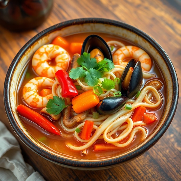 Een verwarmende soep die zachte rijstnoedels combineert met een verscheidenheid aan zeevruchten en knapperige groenten, perfect voor een warm en troostend gerecht.