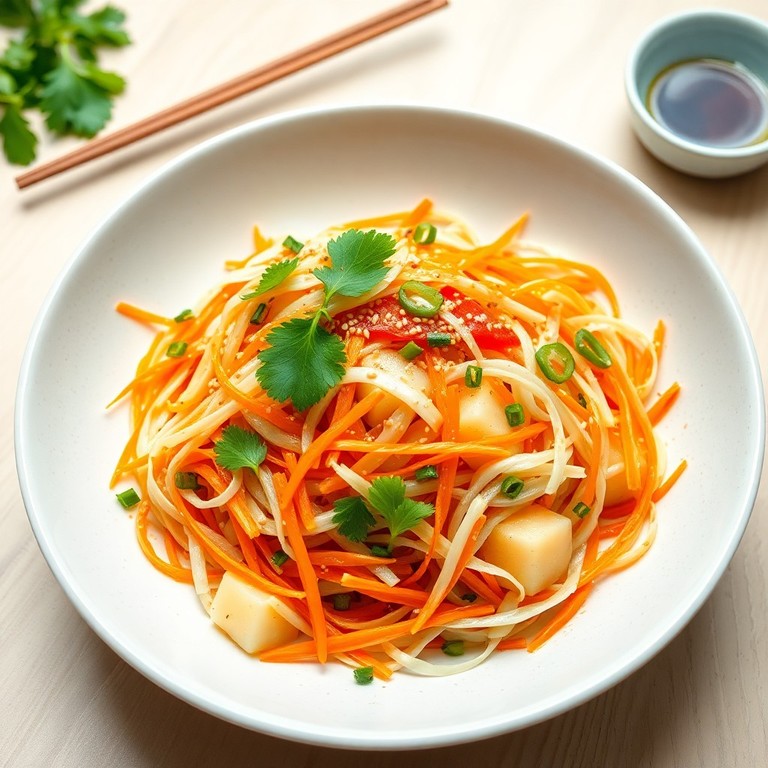 Ein knackiger, asiatisch inspirierter Gemüsesalat, der rohes und blanchiertes Gemüse wie Karotten, Kohl und Kartoffeln mit einem cremigen, würzigen Miso-Dressing vereint. Perfekt als leichtes Mittagessen oder als Beilage zu asiatischen Gerichten. Das Dressing besticht durch eine harmonische Mischung aus weißer Miso-Paste, Sesamöl und Limettensaft. Frische Kräuter und gerösteter Sesam sorgen für ein aromatisches und optisch ansprechendes Finish.