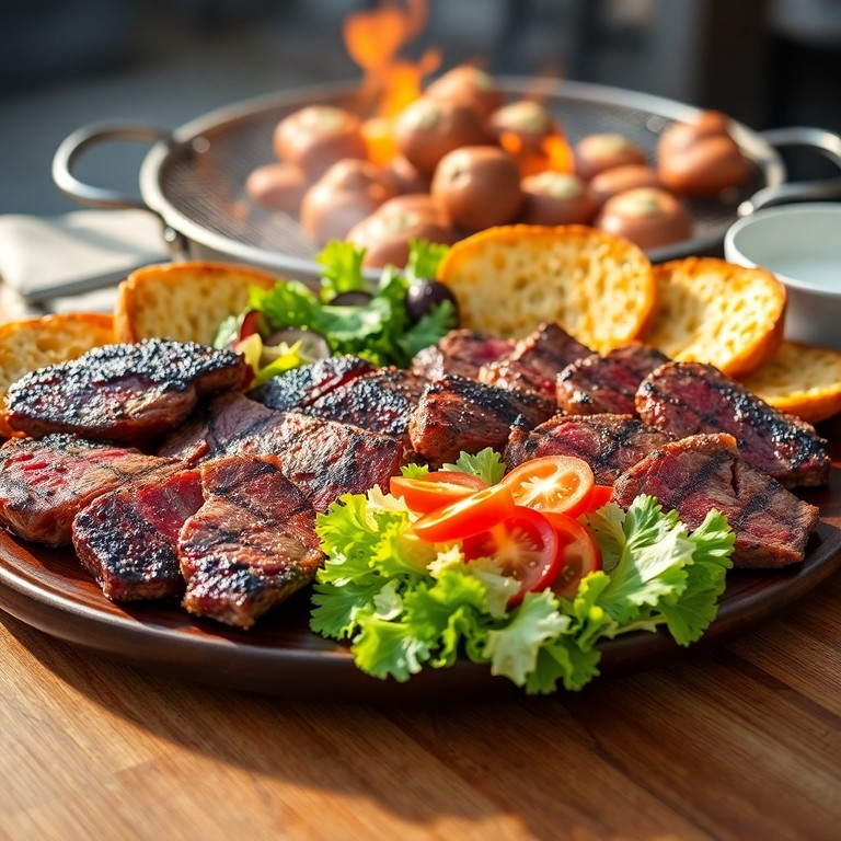 Um churrasco tradicional brasileiro que reúne cortes nobres como picanha, costela e alcatra, grelhados na churrasqueira até a perfeição. Acompanhado de pão de alho crocante e uma salada fresca de tomate e alface, este prato é ideal para um almoço ao estilo típico do Brasil, celebrando sabores autênticos e a convivialidade da mesa.
