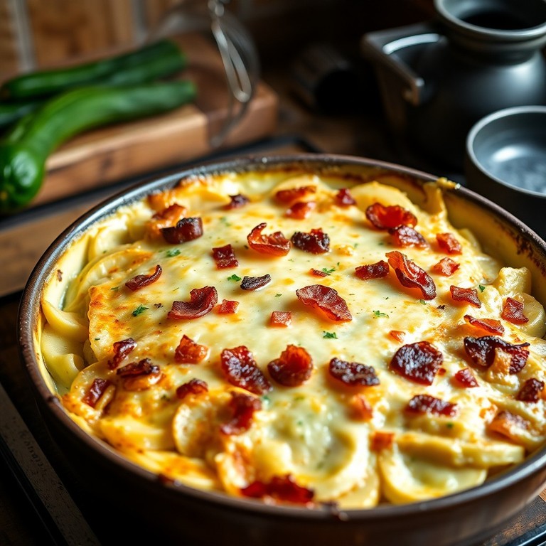 Een romige en geurige ovenschotel met dun gesneden aardappelen en courgette, subtiel gerookt voor extra smaakdiepte, geheel zonder melk en slagroom. Deze gratin gebruikt een plantaardige roomvervanger om dezelfde romige textuur te behouden, perfect als troostrijk hoofdgerecht of smaakvol bijgerecht.