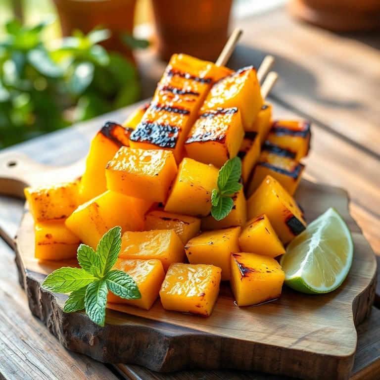 Juicy mango chunks threaded onto skewers and grilled to caramelized perfection, making a delightful sweet snack or a refreshing summer appetizer. This simple recipe highlights the natural sweetness of ripe mangoes enhanced by a touch of honey and a hint of lime, perfect for outdoor gatherings or a light treat.