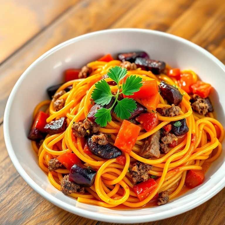 Um almoço vibrante e cheio de sabores exóticos que combina macarrão com azeite de dendê, legumes frescos e carne moída. Esta receita rápida traz a riqueza do azeite de dendê realçada pelos vegetais coloridos e a suculência da carne, resultando em um prato nutritivo e delicioso, perfeito para um almoço especial.