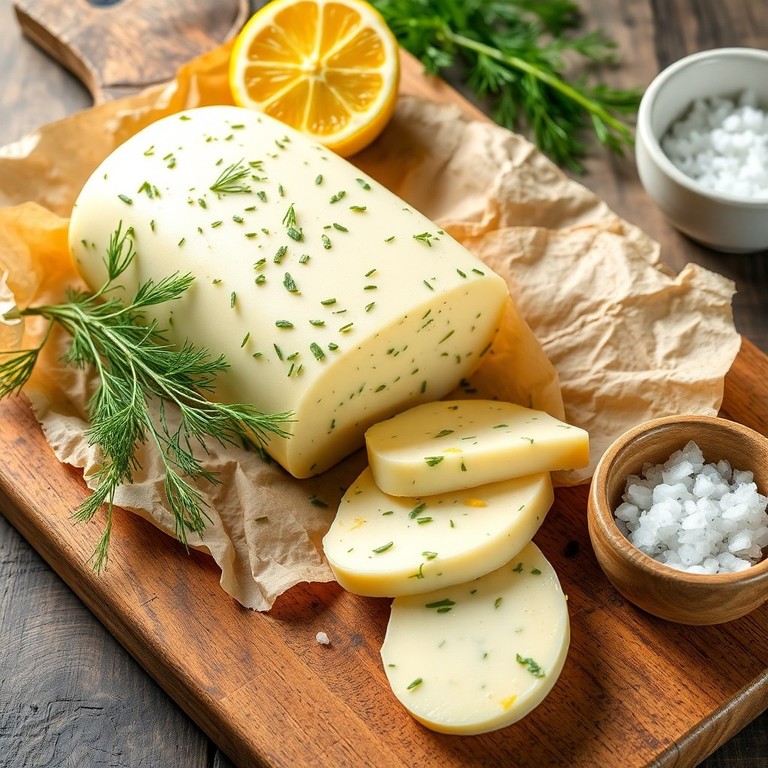 A versatile, aromatic butter combining fresh dill with garlic and lemon for a perfect spread or finishing touch. This herb-infused dill butter enhances the flavor of breads, vegetables, seafood, and grilled meats with its bright, fresh notes and creamy texture.