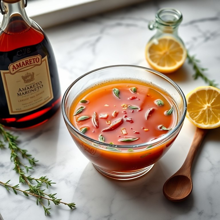 Diese elegante Marinade vereint den süß-nussigen Geschmack von Amaretto mit frischem Zitronensaft, aromatischen Gewürzen und einem Hauch Honig. Sie eignet sich perfekt, um Geflügel oder Schweinefleisch zart und saftig zu machen und verleiht dem Fleisch eine raffinierte, leicht exotische Note. Ideal für Grillabende oder besondere Anlässe.