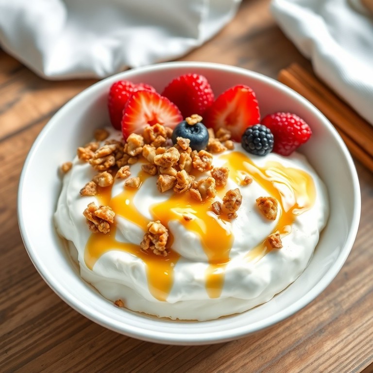 Un desayuno nutritivo y equilibrado que combina la cremosidad del yogur griego espeso con la textura crujiente del muesli, endulzado naturalmente con miel y enriquecido con nueces picadas para aportar grasas saludables y un toque crocante. Ideal para comenzar el día con energía y saciedad.