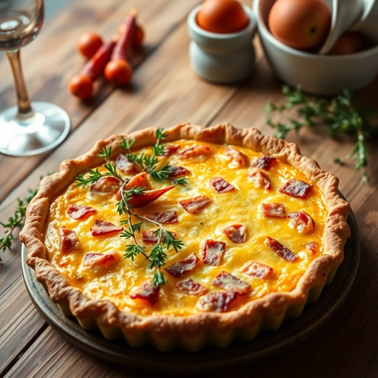 Uma deliciosa Quiche Lorraine com massa quebrada caseira, recheada com bacon defumado, creme de leite, ovos e queijo emmental, temperada com noz-moscada, perfeita para servir quente ou fria.
