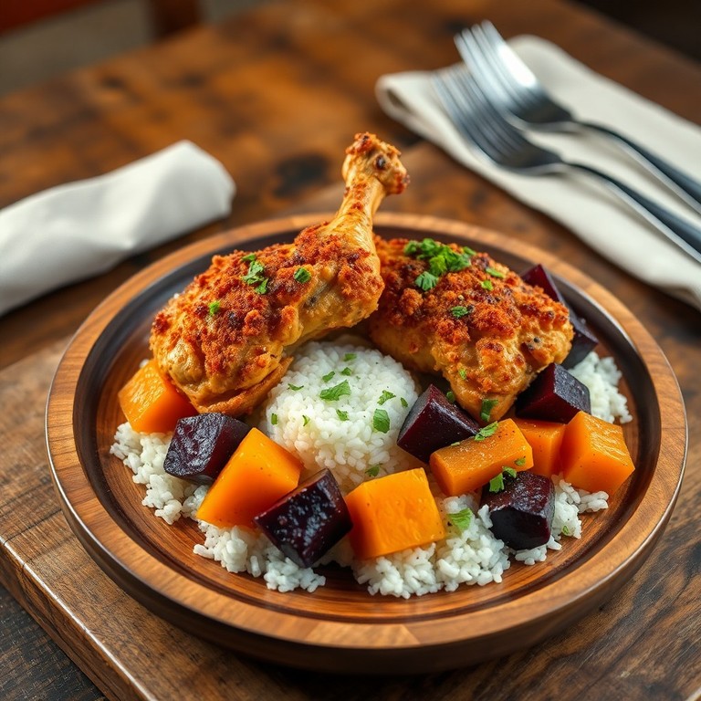 Coxas de frango suculentas empanadas com uma mistura aromática de farinha de trigo e especiarias cajun, assadas até ficarem douradas e crocantes. Servidas com arroz branco soltinho, abóbora em cubinhos assada e beterraba cozida, formando um almoço equilibrado, colorido e cheio de sabor.