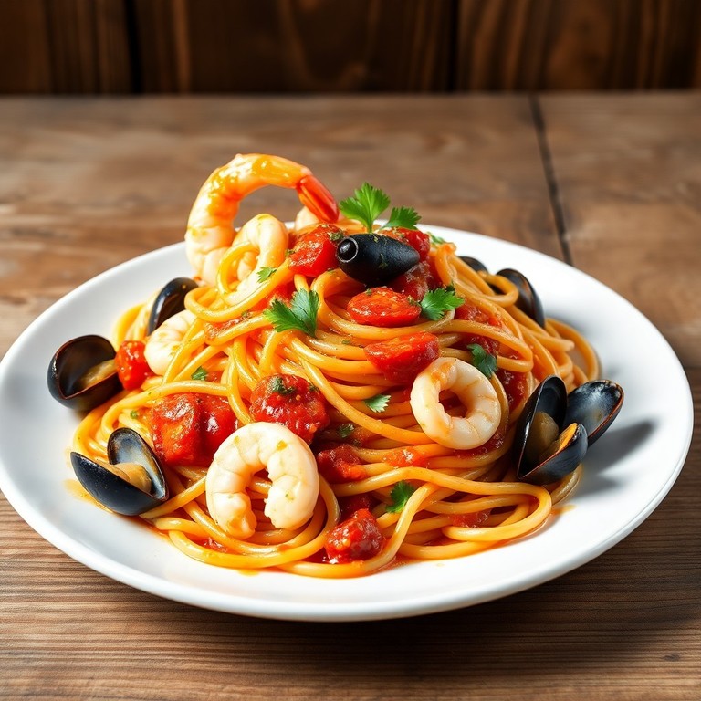 Un clásico plato italiano que combina espaguetis al dente con una salsa marinera rica y aromática, elaborada con tomate, ajo y una variedad de mariscos frescos. Perfecto para una comida rápida y deliciosa que transporta los sabores del mar directamente a tu mesa.
