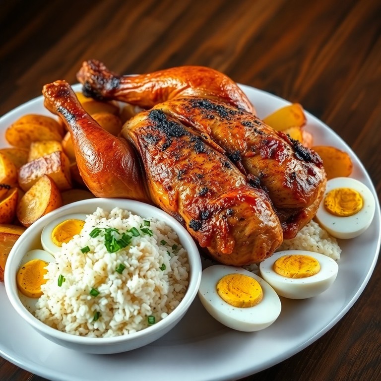Um prato acolhedor que combina frango assado suculento, batatas crocantes e arroz aromático, perfeito para um almoço reconfortante em família.