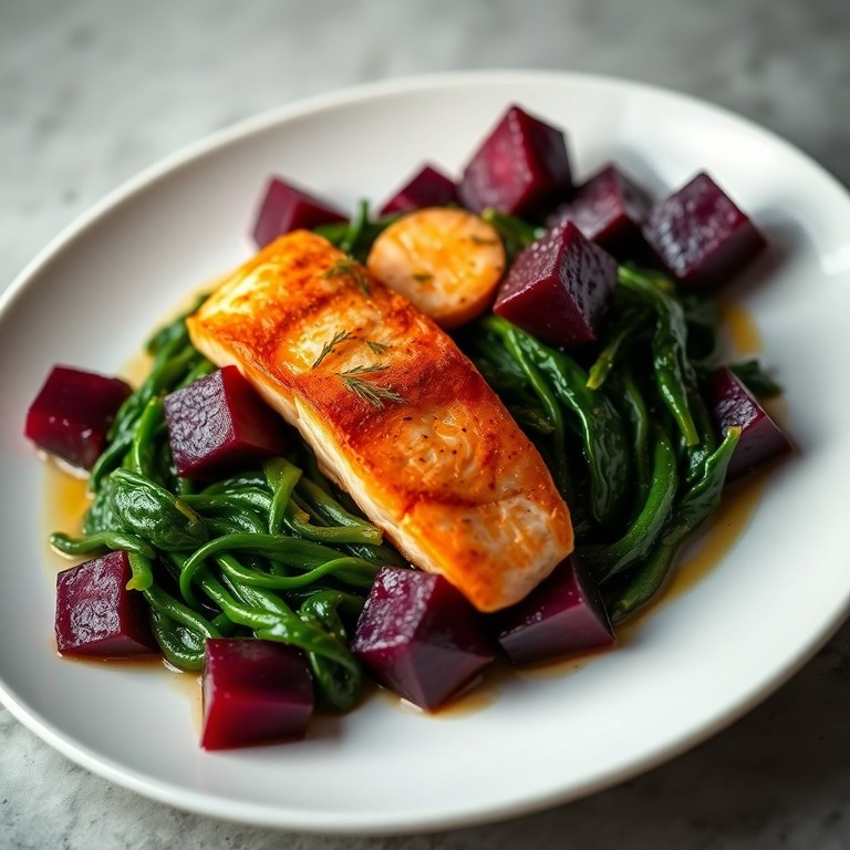 Ein warmes und nahrhaftes Gericht mit süßlich-erdiger gerösteter Rote Bete, zartem, proteinreichem Lachs und frischem, ballaststoffreichem Spinat, perfekt für ein gesundes Abendessen.