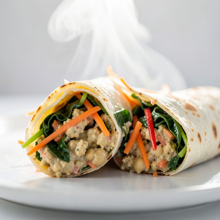 Uma opção vegetariana rápida e satisfatória, recheada com uma pasta cremosa de grão de bico e uma variedade de vegetais frescos e crocantes, perfeita para um almoço leve ou lanche.