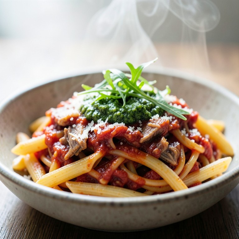 Uma combinação clássica de massa com carne de porco desfiada em molho de tomate, finalizado com um toque fresco de pesto de rúcula e queijo. Um prato reconfortante e cheio de sabor.