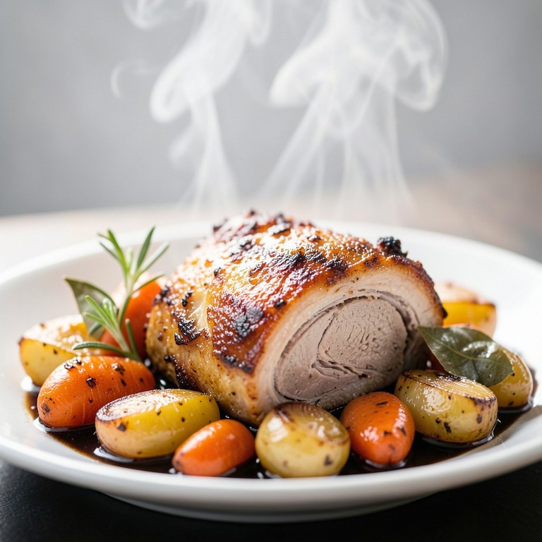 Um joelho de porco suculento e macio, assado lentamente no forno com cerveja escura, cebola, cenoura e batatas, resultando em uma pele crocante e um molho rico e saboroso.