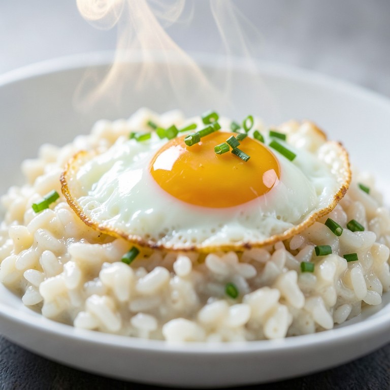Um prato reconfortante e simples, onde o arroz ganha uma textura aveludada com a margarina e o leite, servido com um ovo de gema mole que cria um molho natural ao ser rompido.
