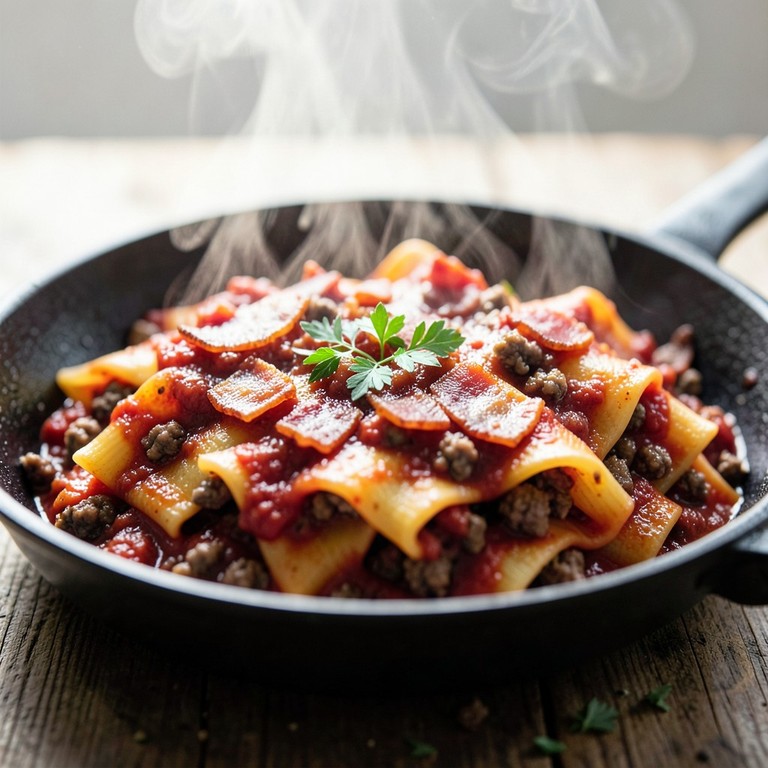 Uma versão prática e rápida da clássica lasanha, preparada inteiramente na frigideira. Com carne moída suculenta, bacon defumado e um molho vermelho rico, é a solução perfeita para um almoço saboroso em poucos minutos.