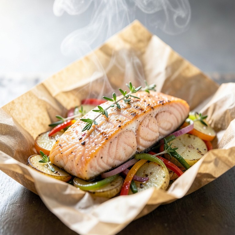 Uma técnica clássica francesa que preserva o sabor e a suculência do salmão, cozinhando-o no vapor junto com batatas laminadas e vegetais frescos dentro de um pacote de papel manteiga.