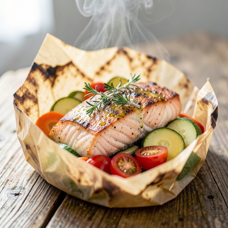 Um prato saudável e aromático onde o salmão cozinha no próprio vapor junto com vegetais frescos, mantendo toda a suculência e nutrientes em uma apresentação elegante e prática.