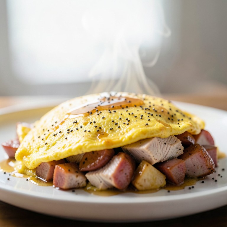 Uma omelete nutritiva e aromática, preparada com farinha de centeio e sementes de chia, recheada com uma combinação suculenta de peru e salsichas caramelizadas em um molho cítrico de mel.