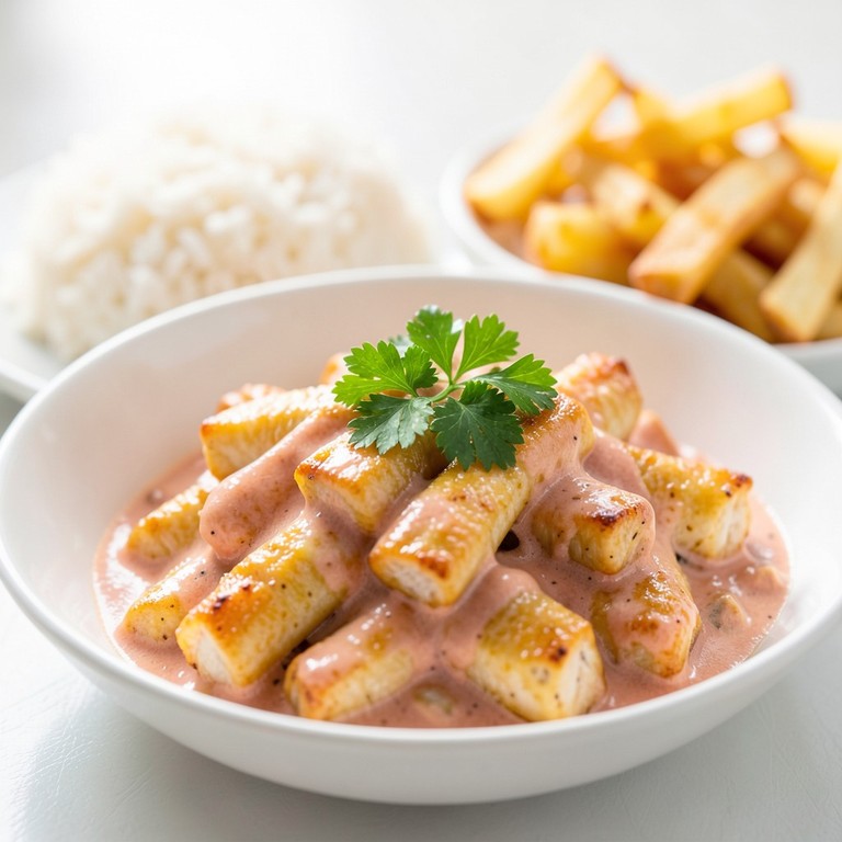 Um prato clássico e reconfortante, feito com tiras de frango suculentas em um molho cremoso e aveludado, ideal para uma refeição rápida e saborosa.