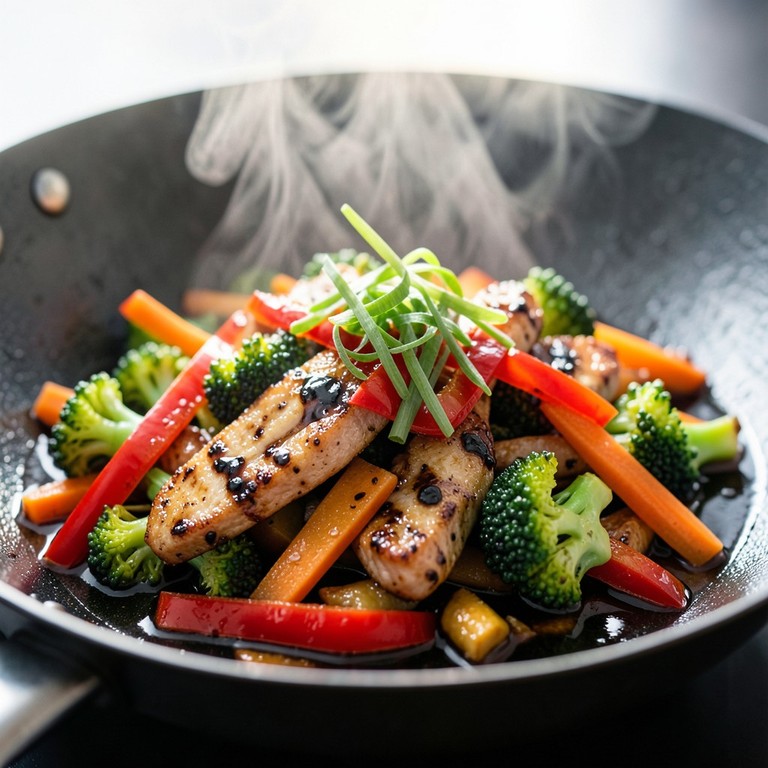 Tiras de peito de frango refogadas com vegetais crocantes em fogo alto para uma refeição leve e nutritiva, pronta em poucos minutos.