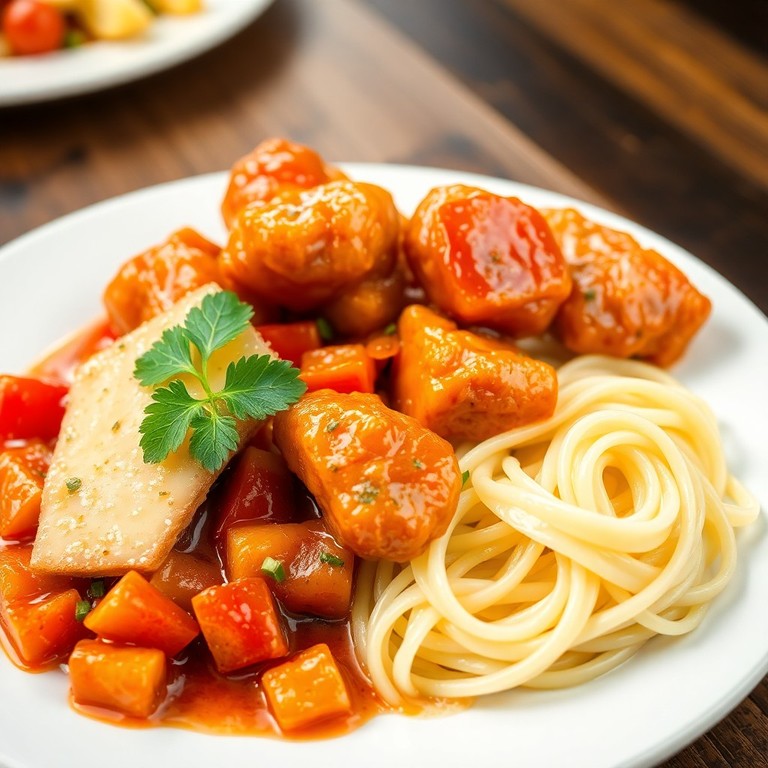 - Курица в кисло-сладком соусе с яичной лапшой и копченым сыром