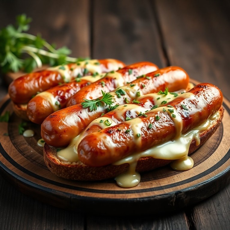 Баварские колбаски на черном хлебе с сыром и чесноком