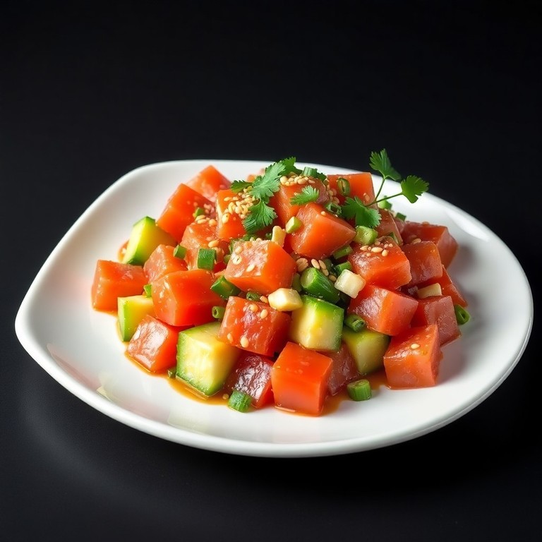 - Тунец в японском стиле с помидорами и огурцами