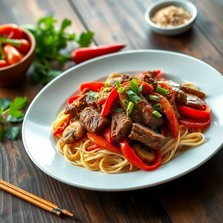- Тайский говяжий стир-фрай с шампиньонами и болгарским перцем
