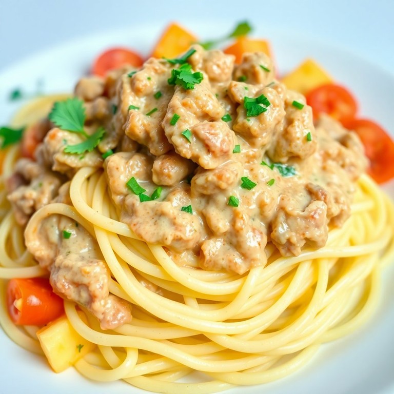 Спагетти с нежным мясным соусом и сливками