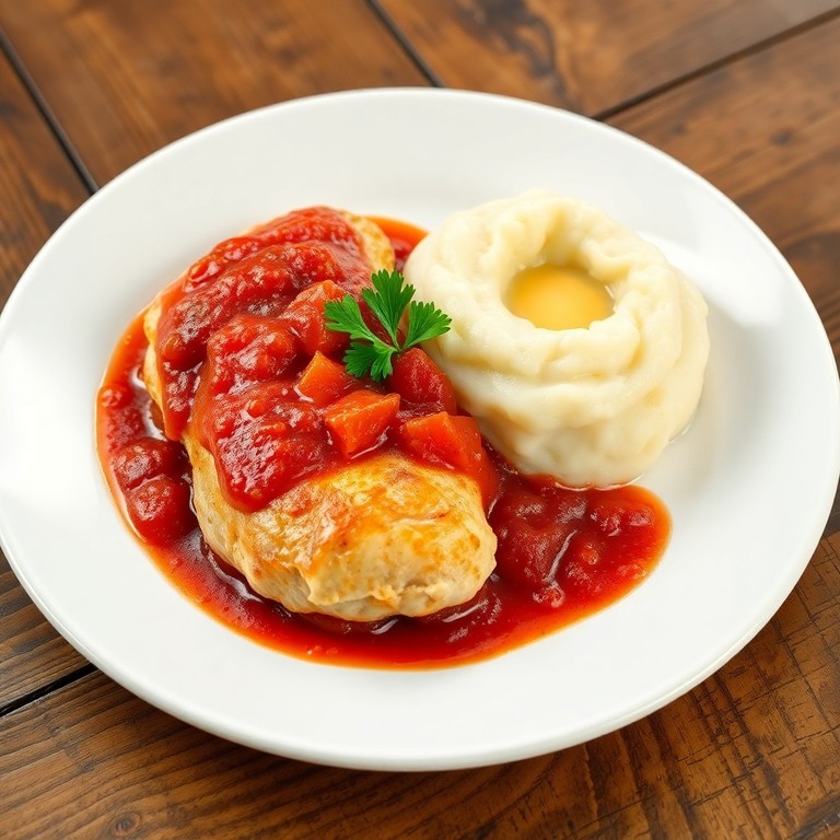 - Куриное филе в томатно-чесночном соусе с картофельным пюре