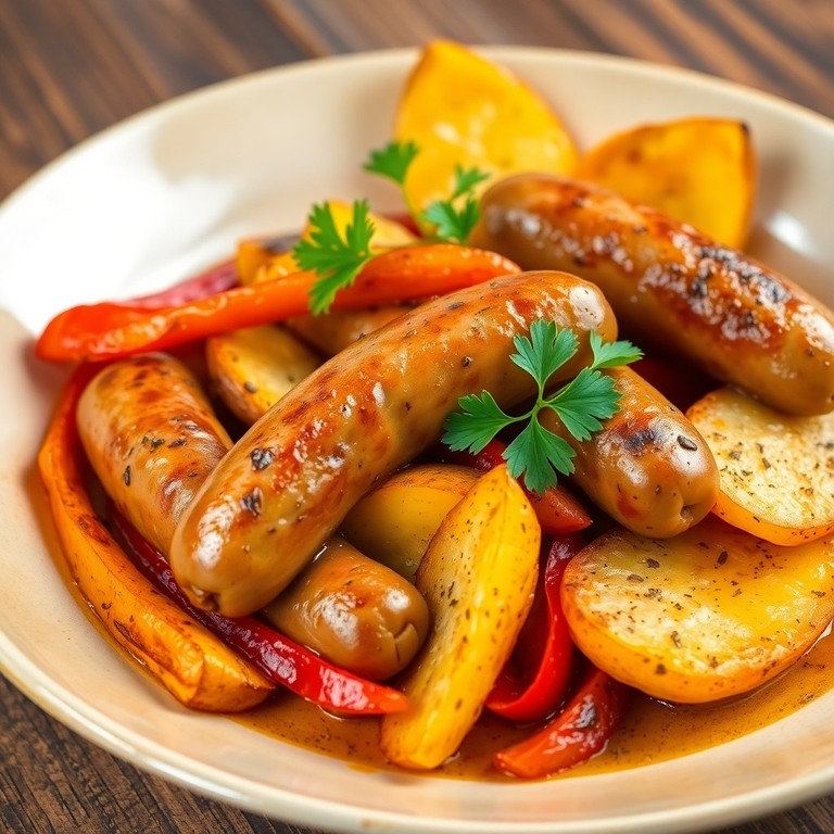 - Запеченные сосиски с перцем и картофельными дольками в стиле испанской кухни