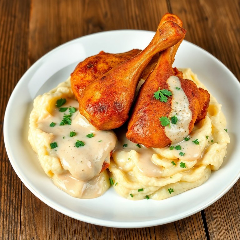 - Запечённые куриные ножки с картофельным пюре и сливочным соусом