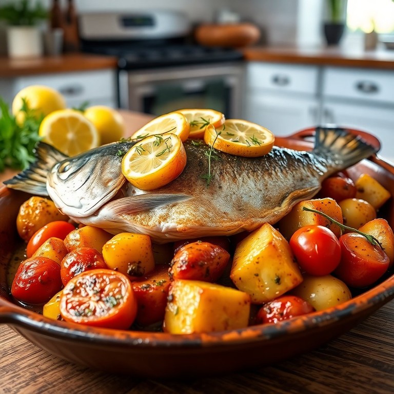 Форель, запеченная с картофелем и помидорами
