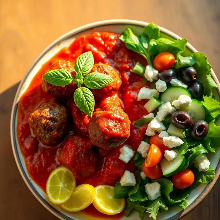 - Albóndigas de Res en Salsa de Tomate Casera con Ensalada Mediterránea
