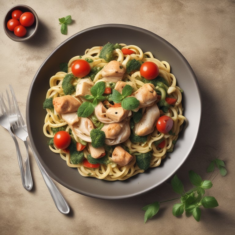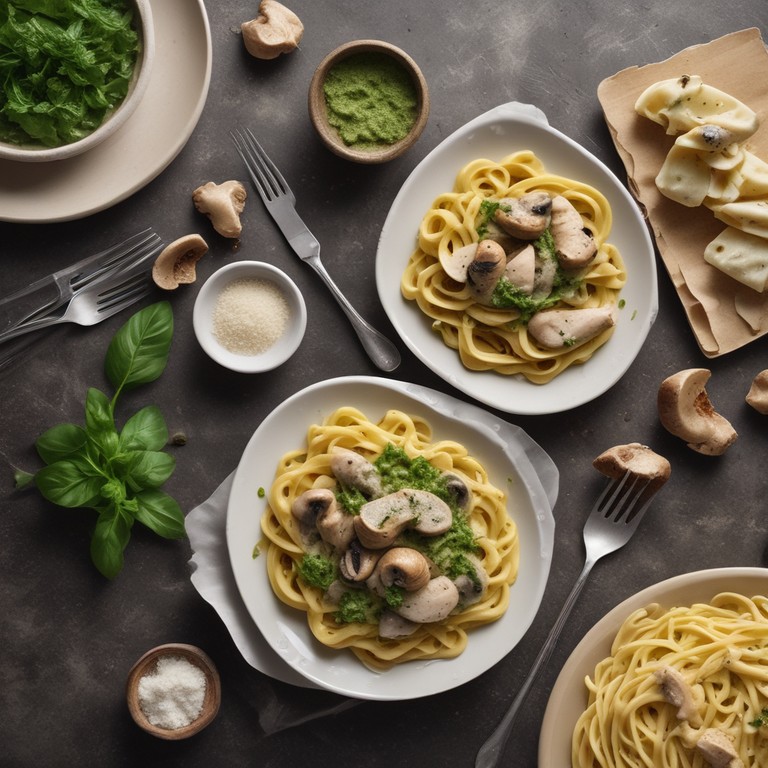 Паста с соусом песто, курицей и шампиньонами в сливочном соусе