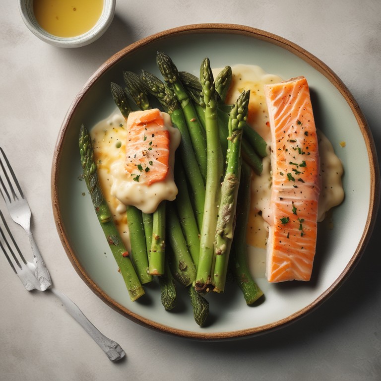 Запечена спаржа з лососем під сирним соусом