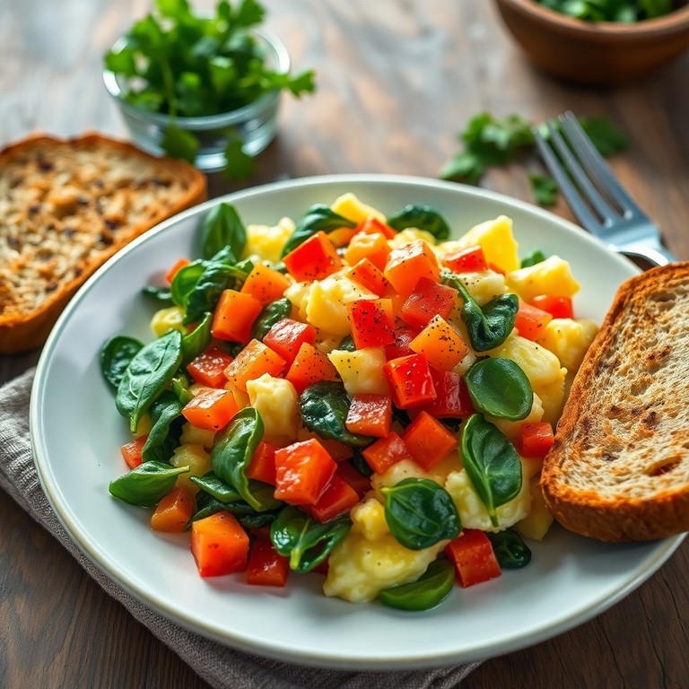 Яичница-болтунья с овощами и тостами из цельнозернового хлеба