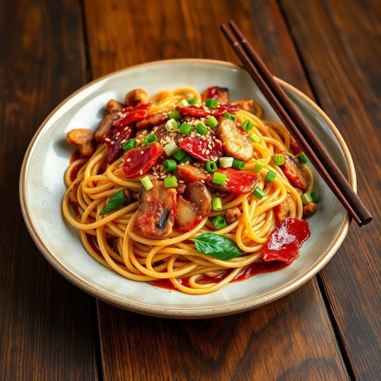 Макароны по-азиатски с беконом и грибами