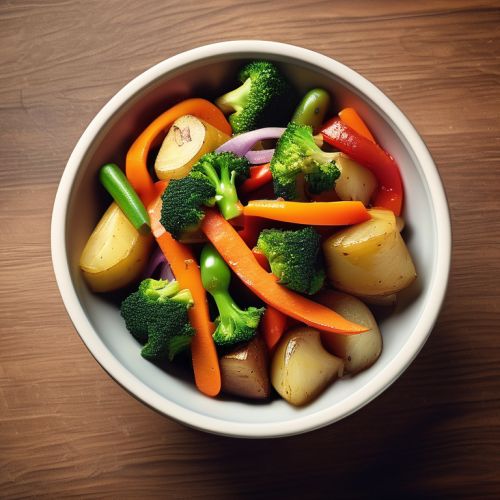 Gemüsepfanne mit Möhren, Bohnen, Brokkoli, Paprika, Zwiebeln und Kartoffeln