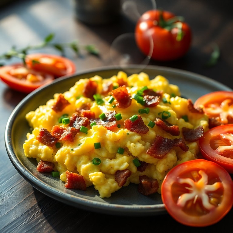 Пышная Яичница-Болтунья с Хрустящим Беконом и Свежей Зеленью