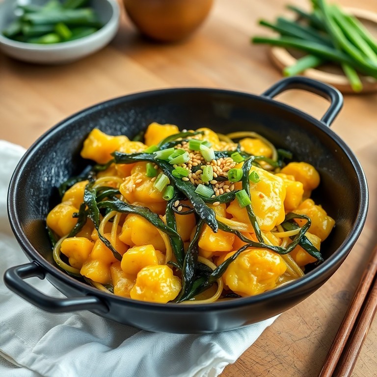 Яичница в воке с морской капустой и кунжутом