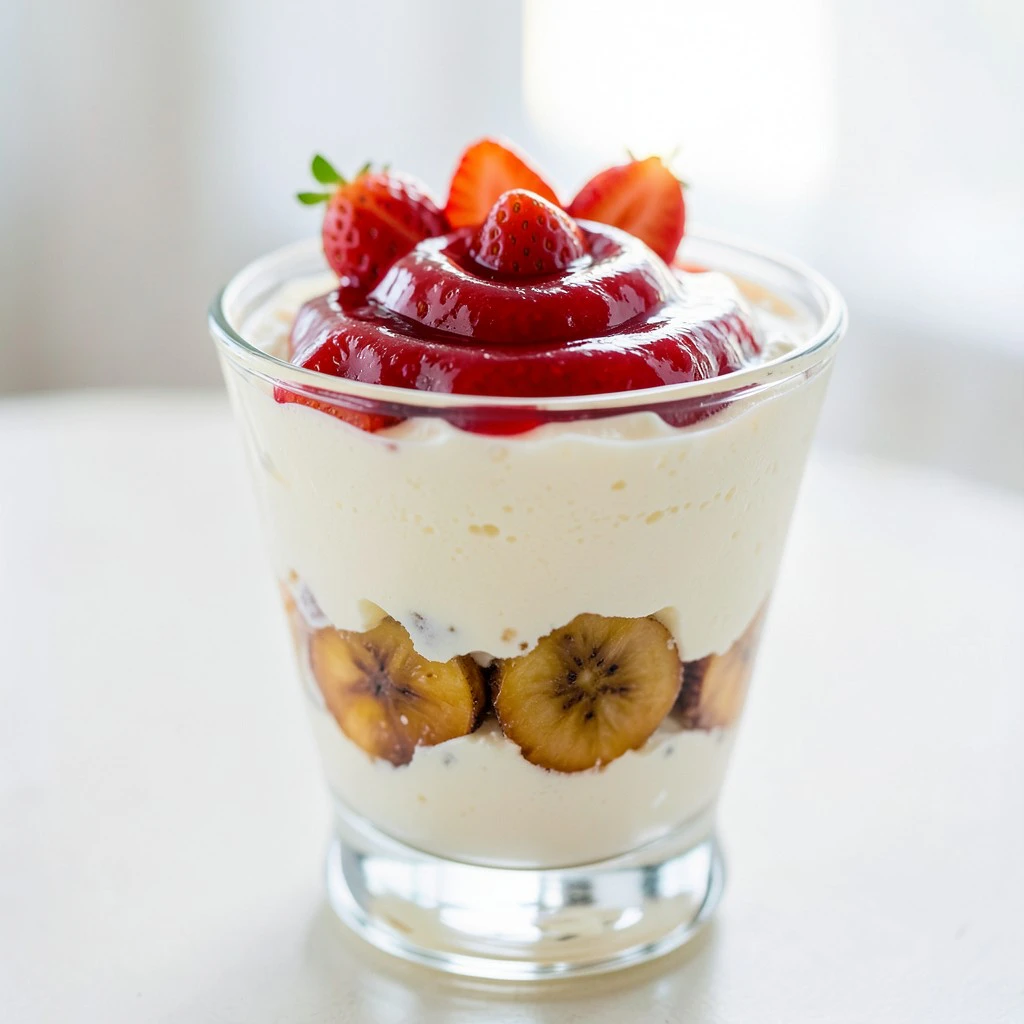 Воздушный творожный мусс с карамелизированным бананом и клубникой