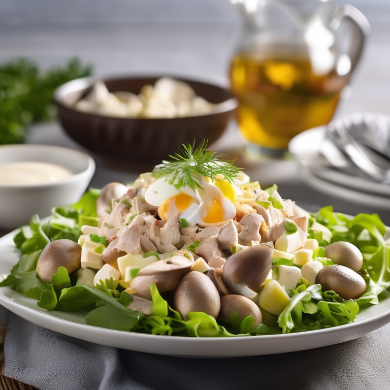 Вкусный и сытный салат с нежным курином мясом, ароматными грибами, сыром, вареными яйцами и майонезом.