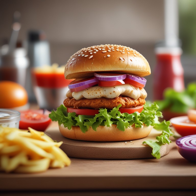 A delicious and juicy chicken burger that will satisfy your cravings for a flavorful and fulfilling meal. This recipe combines tender chicken patties with fresh vegetables and creamy sauces, all nestled between soft burger buns.