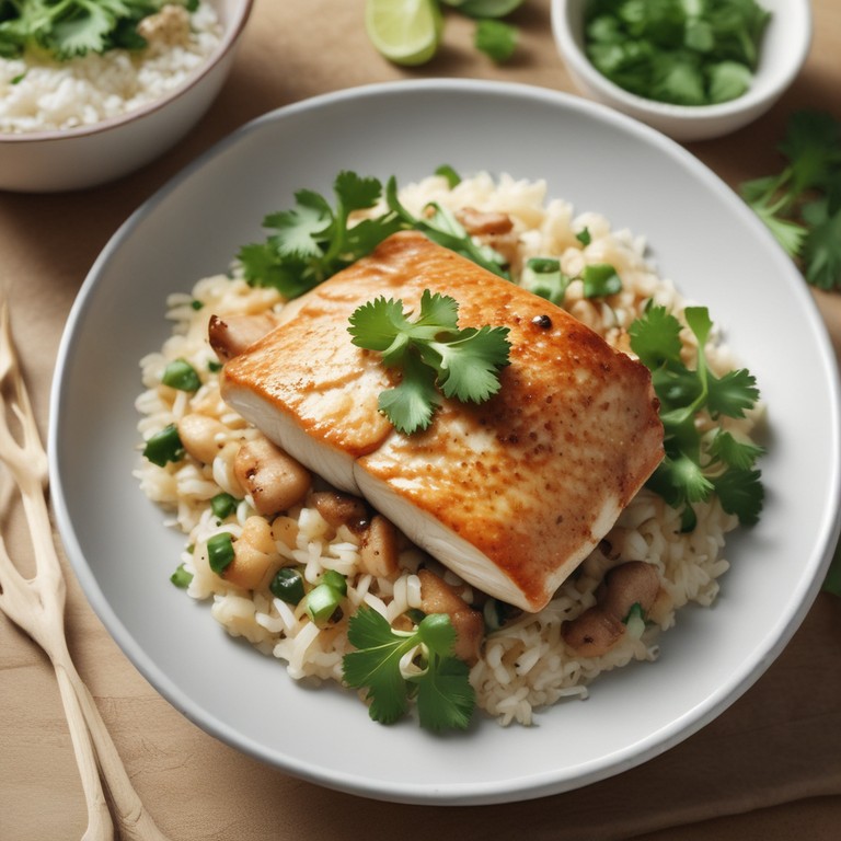 Ein köstliches und aromatisches asiatisches Gericht mit zartem Fisch und würzigem Ingwer auf einer Bett aus duftendem Reis.